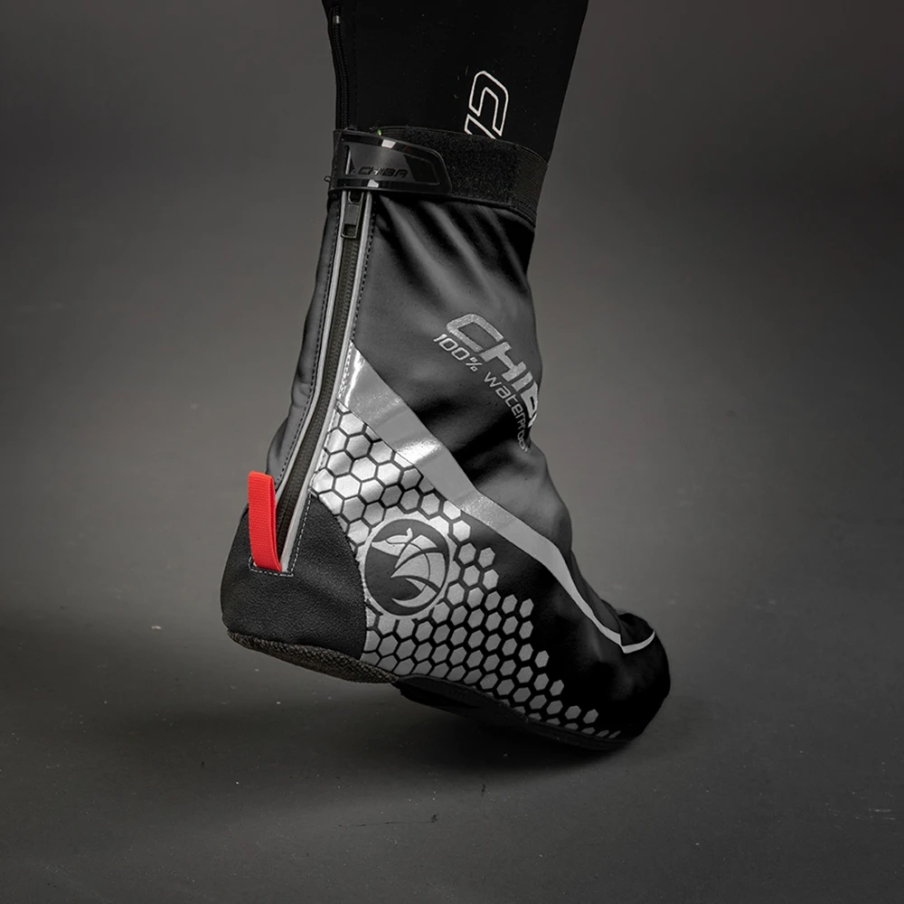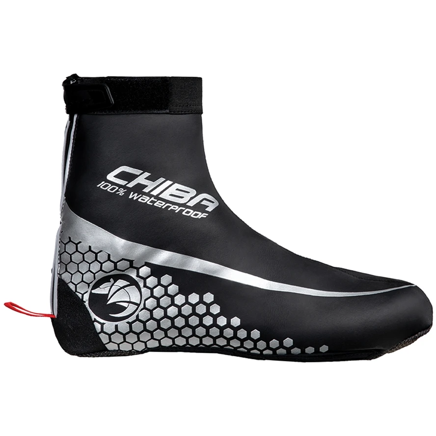 Waterproof, windproof and breathable overshoe with soft fleece inside and reflective stripes outside.