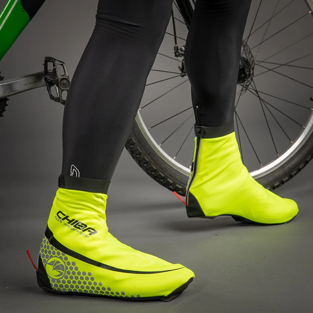 Waterproof, windproof and breathable overshoe with soft fleece inside and reflective stripes outside.